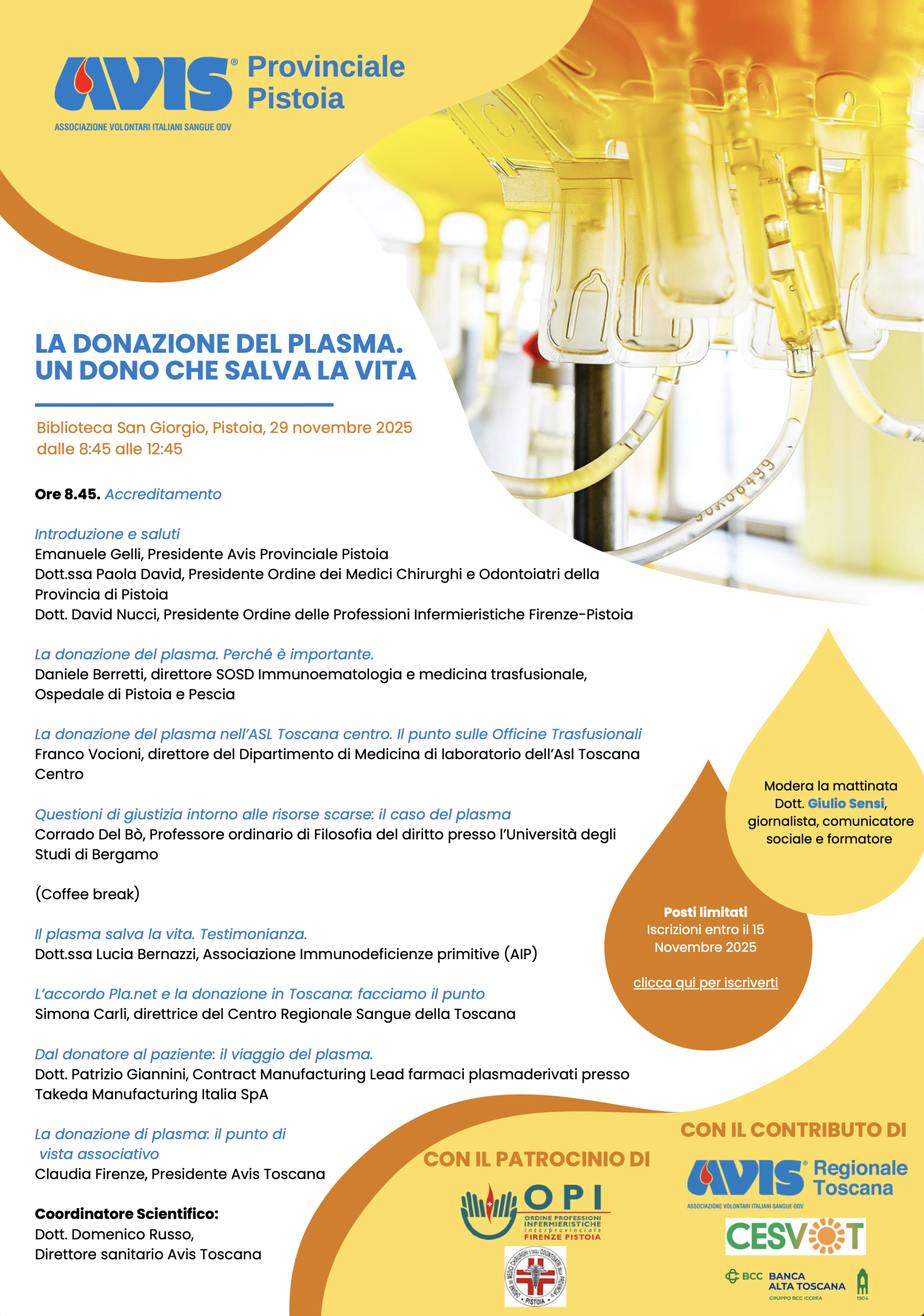 Avis Provinciale Pistoia organizza per sabato 29 novembre 2025 presso la Biblioteca San Giorgio di Pistoia il convegno dal titolo “Donazione del plasma, un dono che salva la vita”.